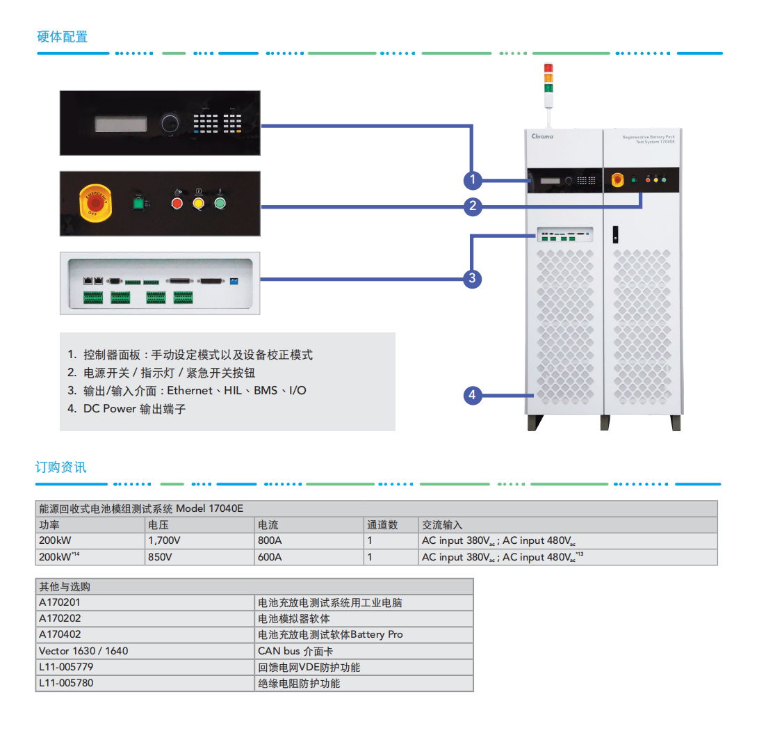 Chroma 17040E电池模组测试系统是专为高功率二次电池组测试而开发的高精密充放电设备,具有能源回收功能,可节省放电过程所消耗的大量电能,即使动态充放电,也能确保电网端维持稳定,不致因谐波污染影响其他设备。